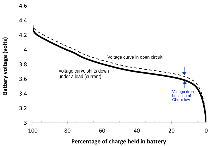 I will digress a little here to explain this drop in voltage. For that, we need to recall some high-school physics: Ohm’s law. When electrical current flows through the battery, the actually voltage is reduced by an amount equal to the electrical current multiplied by the battery resistance.