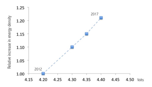 If you are a battery vendor and need to increase energy density, what can you do? First, you can pack more material inside the battery to store more of the lithium ions. Second, you can increase the voltage. If you recall from your high-school physics, electrical energy is the product of electrical charge × voltage. More voltage translates to more energy. If we look at the maximum voltage of batteries that have been shipping commercially in the past few years, we immediately notice that the voltage has risen from 4.20 V to 4.40 V for one individual cell. We even see prototypes today at 4.45 V and above. The chart below shows that going from 4.20 V to 4.40 V provides an additional 20% in energy, or the equivalent of four battery generations.