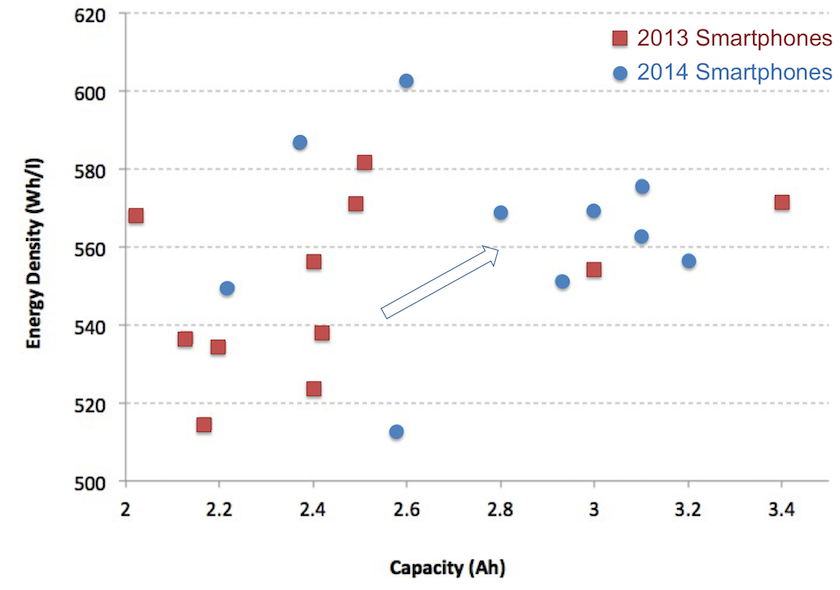 So let’s look at the evolution of the battery in the last two years, and how it has impacted the design and functionality of the modern smartphone. The following chart shows the energy density in Watt-hours per liter (energy per unit of volume) plotted against the charge capacity (in A.h) for a survey of smartphones released in 2013 (red squares) and 2014 (blue dots).