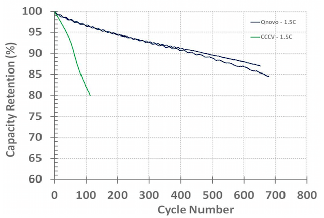 This second graph shows the longevity (or cycle life) of the battery. You will charge your battery over 500 hundred times (cycles) before the battery loses a mere 10% of its available charge capacity (the blue curve). If you were to do the same fast charging using conventional CCCV charging, then the result would be disastrous: Only 100 cycles, or a couple of months of operation before you declare your battery wasted and needing replacement (that’s the green curve in this chart).