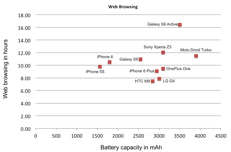 The picture now gets a little more involved. Clearly a bigger battery equals more time, but also the choice of smartphone does matter. For example, Apple and Sony seem to do a better job managing the power budget than HTC and LG do. Nonetheless, the chart is also specific in saying that if you are gunning for about 10 hours or more of screen time per day on a device that has a 5-in display, then the battery capacity needs to be right around 3,000 mAh (or more).