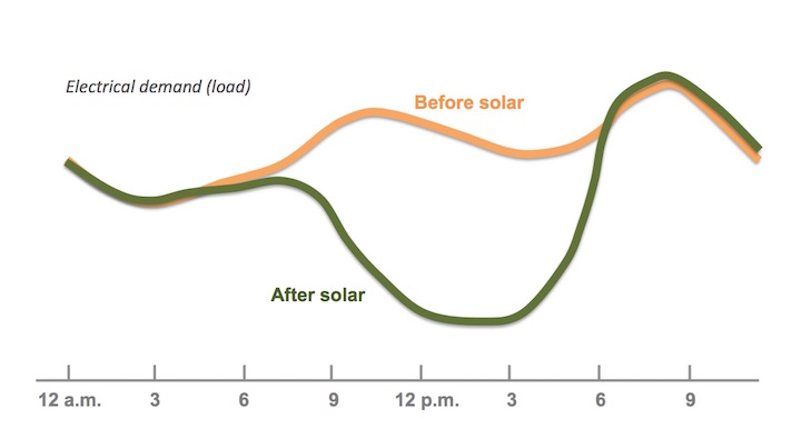Now let’s see what happens to this load curve after many residents in your town install solar panels. As expected, the load during the day time drops, and it drops drastically. This curve, as its shape suggests, is called the “duck curve.” It creates a serious headache for your local utility. These generators that historically supplied your home with electricity are now running at a much reduced capacity during the day. In other words, the utility has idle capacity yet it bore the expense of the generators. Worse yet, it still has to size the generating capacity of the power plant to the maximum needed load which is now in the evening hours when solar is not a factor.